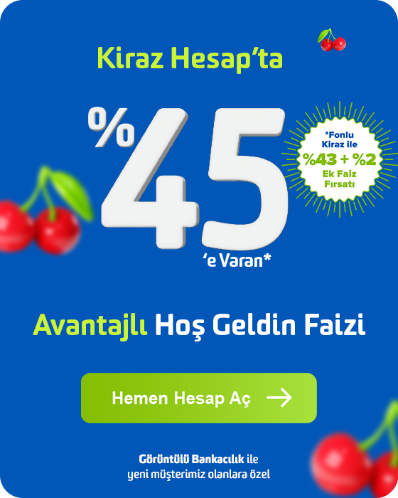 Görüntülü Bankacılıkla kolayca müşterimiz olun ve Kiraz Hesap'ınızı açın %45’e varan avantajlı faiz oranından kazanmaya başlayın. TL Kiraz Hesap’ta %43 Hoş Geldin Faizi’ne ek, Fonlu Kiraz ile aynı gün +%2 ek faiz kazanın.