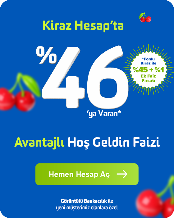 Görüntülü Bankacılıkla kolayca müşterimiz olun ve Kiraz Hesap'ınızı açın %46’ya varan avantajlı faiz oranından kazanmaya başlayın. TL Kiraz Hesap’ta %45 Hoş Geldin Faizi’ne ek, Fonlu Kiraz ile aynı gün +%1 ek faiz kazanın.