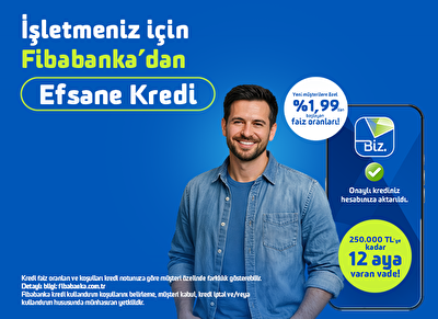 - İşletmenize özel nakit ihtiyaçlarınız için şubeye gitmeden, size özel ön onaylı limitinizi anında FibabankaBiz Mobil uygulaması veya web sitesi üzerinden öğrenebilir, Esnaf, KOBİ veya münferit yetkili limited şirket iseniz dakikalar içerisinde görüntülü bankacılık ile Fibabanka müşterisi olup Efsane Kredi başvurusunda bulunabilir ve onaylanması halinde yeni müşterilere özel %1,99’dan başlayan avantajlı faiz oranlarıyla 250.000 TL’ye kadar ve 12 aya varan vadeyle kredinizi anında kullanabilirsiniz.