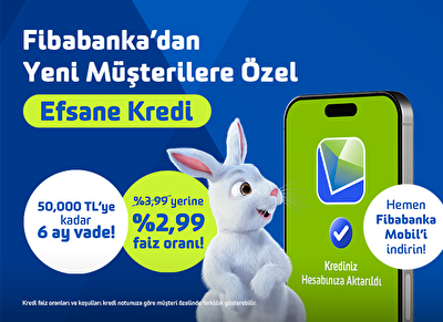 Hemen BaşvurGörüntülü bankacılık kanalıyla ilk kez Fibabanka müşterisi olanlara özel, 50.000 TL ve 6 ay vadeye kadar %2,99 faizli bireysel ihtiyaç kredisi fırsatı!