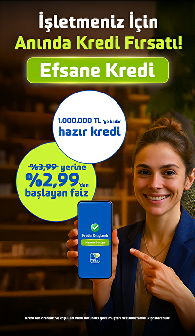 İşletmenizin nakit ihtiyaçlarını dakikalar içerisinde çözmek için en uygun faiz oranlarına sahip Efsane Kredi’ye hemen başvurabilirsiniz.