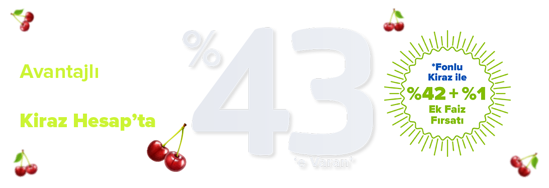 Görüntülü Bankacılıkla kolayca müşterimiz olun ve Kiraz Hesap'ınızı açın %46’ya varan avantajlı günlük faiz oranından kazanmaya başlayın. TL Kiraz Hesap’ta %44 Hoş Geldin Faizi’ne ek, Fonlu Kiraz ile aynı gün +%2 ek faiz kazanın. Üstelik Ekstra Kazan avantajıyla bir sonraki ay +%2,50'ye varan ek faiz fırsatından da yararlanabilirsiniz.
